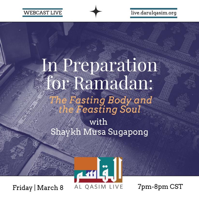 PresentationsIn Preparation for Ramadan: The Fasting Body and the Feasting SoulWatch the Webcast RecordingJan 03, 20244ShareSpeaker: Shaykh Musa Sugapong